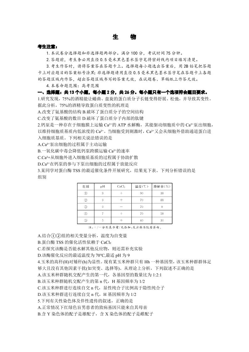 安徽省皖江名校联盟2024届高三开学摸底考试 生物