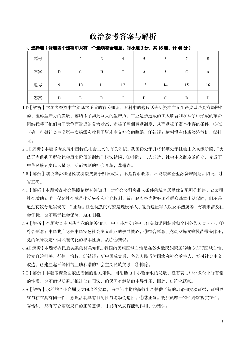 安徽省皖江名校联盟2024届高三开学摸底考试 政治答案