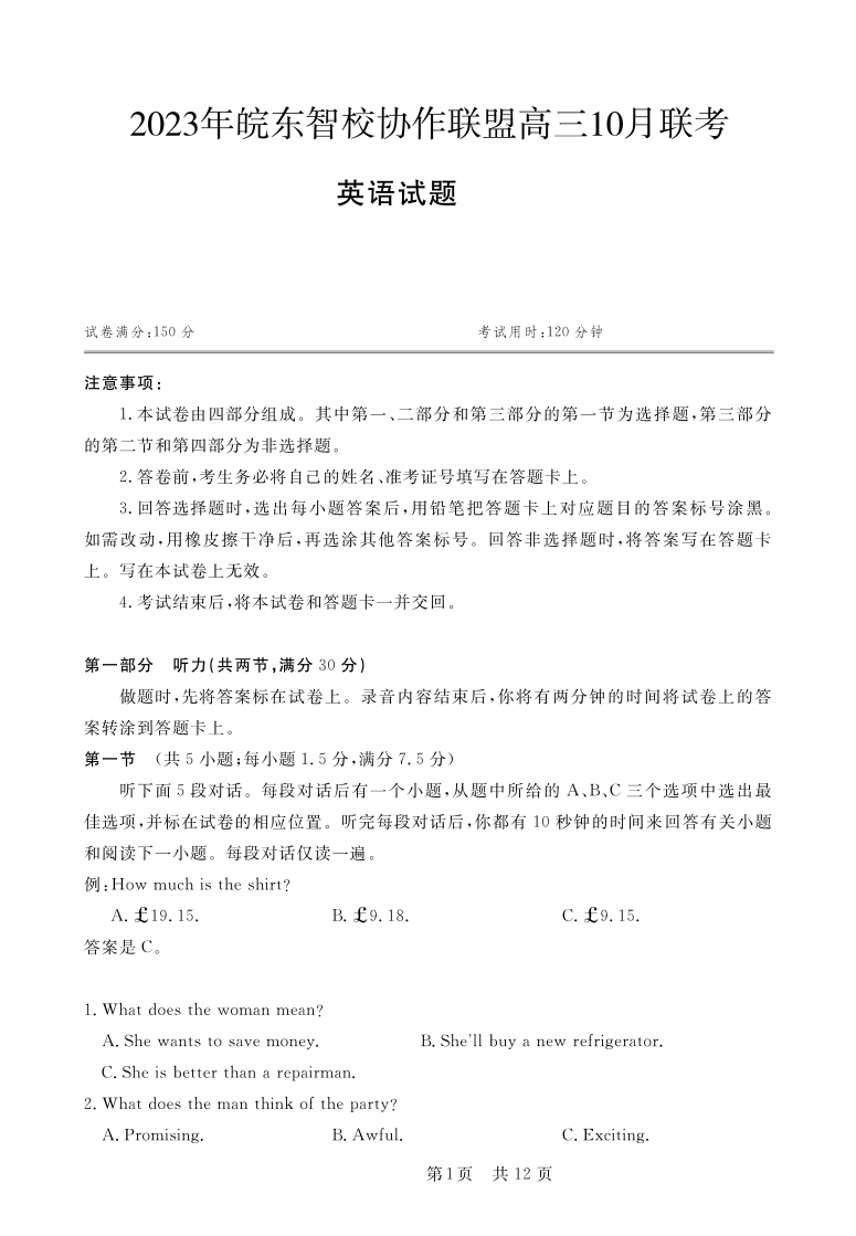 安徽省皖东智校协作联盟2024届高三上学期10月联考 英语