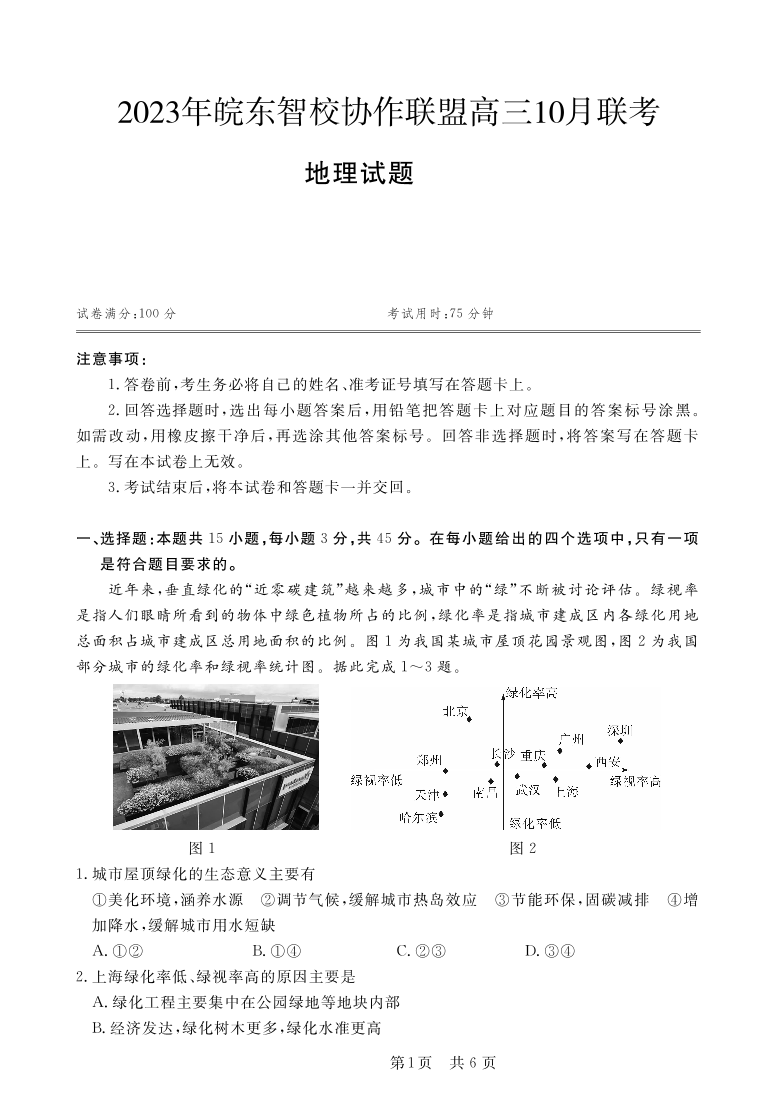安徽省皖东智校协作联盟2024届高三上学期10月联考 地理
