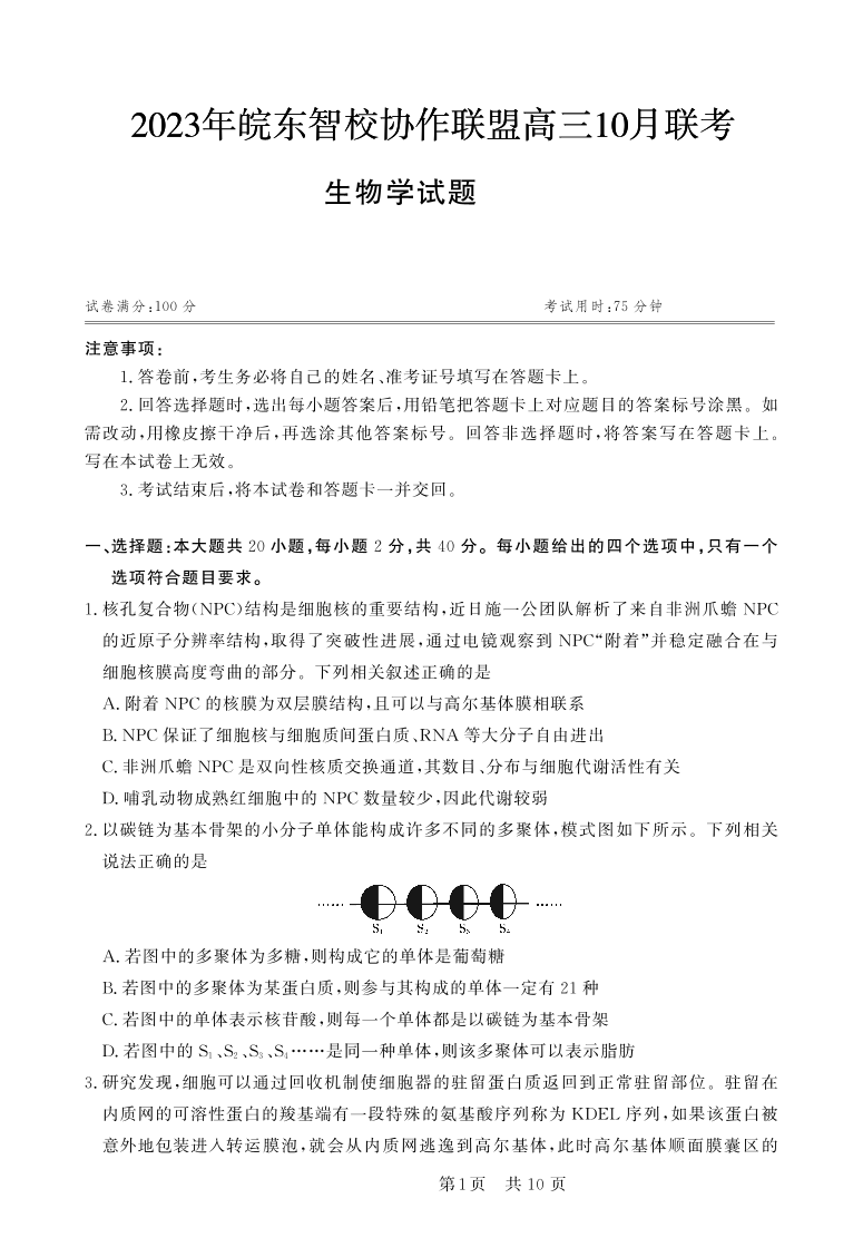 安徽省皖东智校协作联盟2024届高三上学期10月联考 生物学