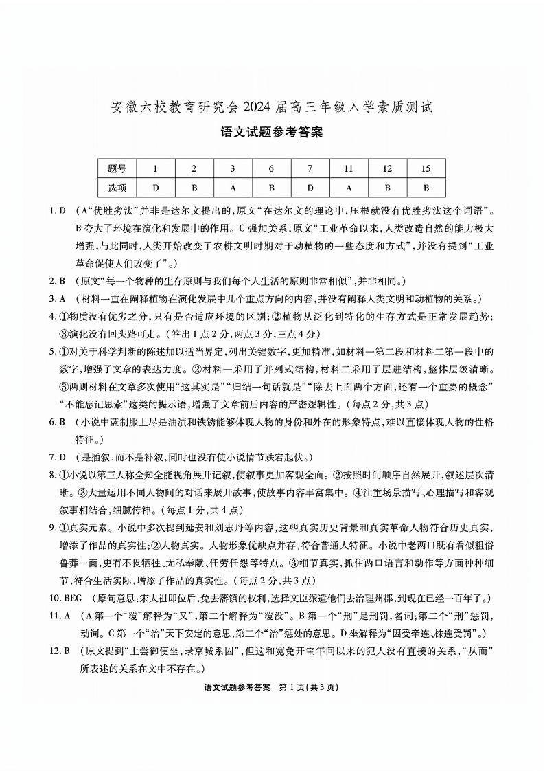 安徽省六校教育研究会2024届高三入学考试 语文参考答案