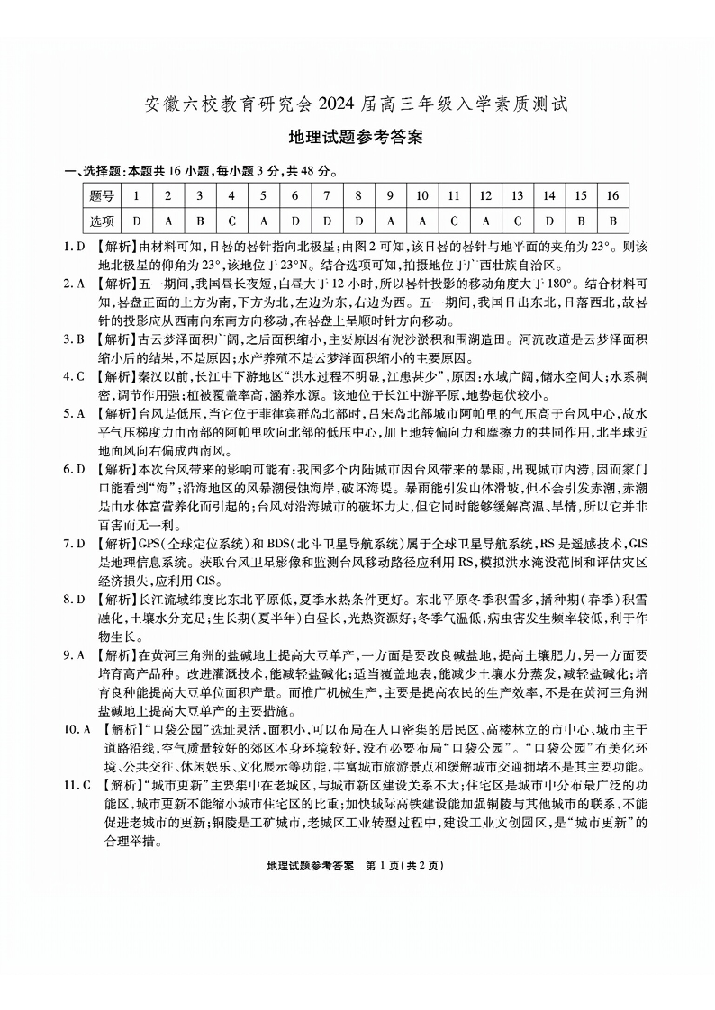 安徽省六校教育研究会2024届高三入学考试 地理参考答案