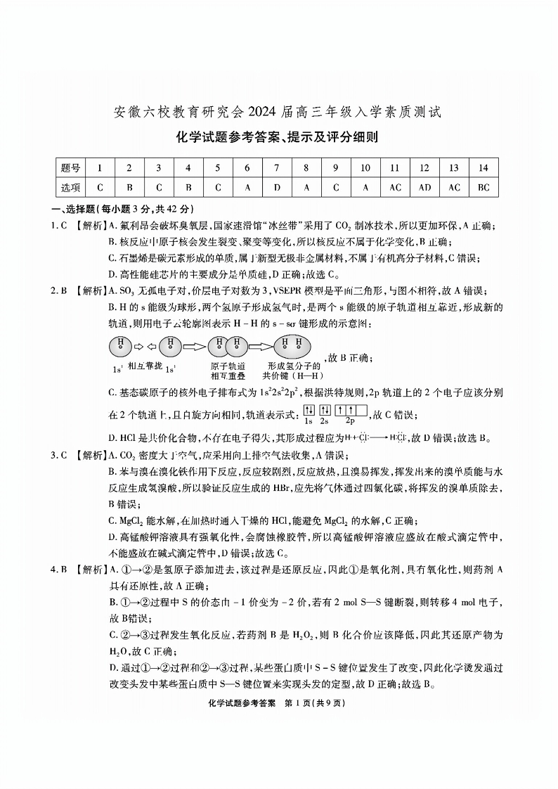安徽省六校教育研究会2024届高三入学考试 化学参考答案
