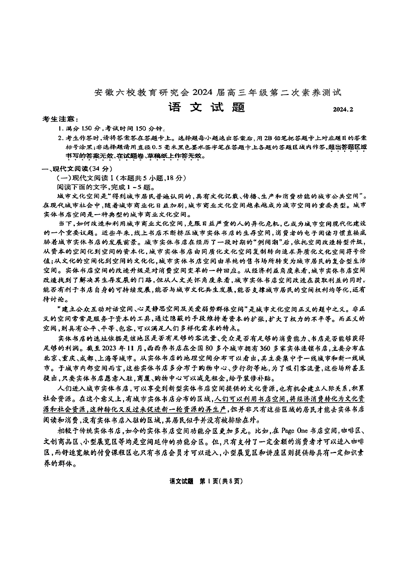 安徽省六校教育研究会2023-2024学年高三下学期下学期第二次素养测试(2月)语文