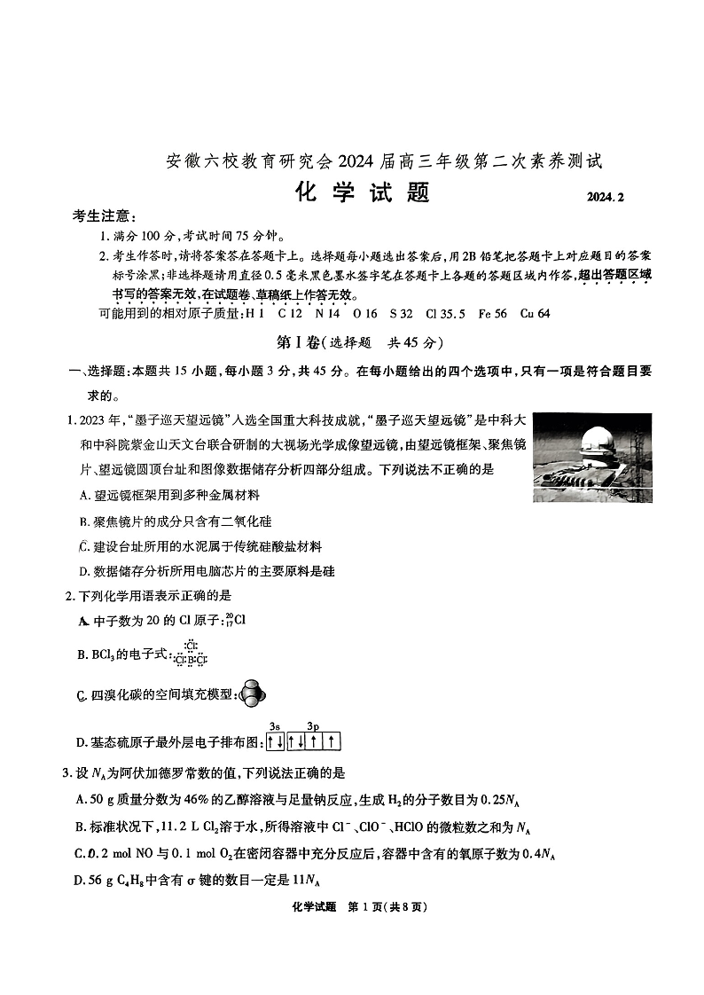 安徽省六校教育研究会2023-2024学年高三下学期下学期第二次素养测试(2月)化学