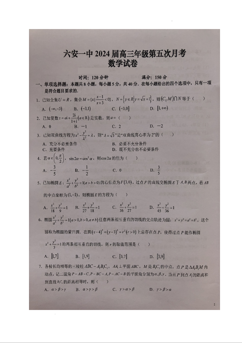 安徽省六安市第一中学2023-2024学年高三上学期第五次月考 数学