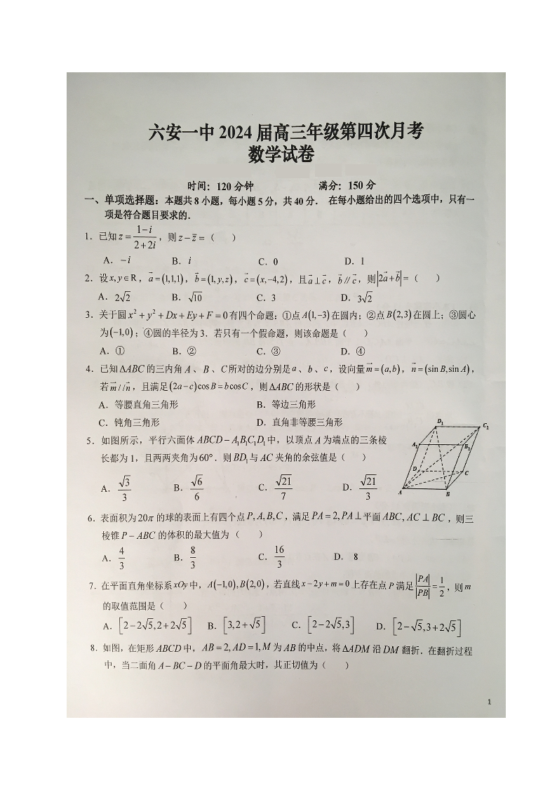 安徽省六安第一中学2023-2024学年高三上学期第四次月考 数学