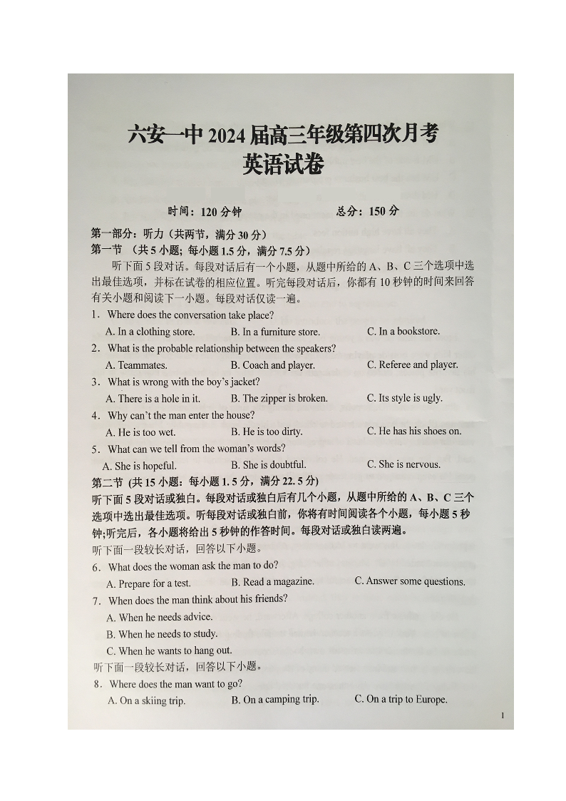 安徽省六安第一中学2023-2024学年高三上学期第四次月考 英语