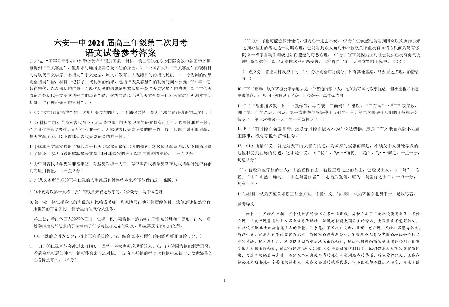 安徽省六安第一中学2023-2024学年高三上学期第二次月考 语文答案