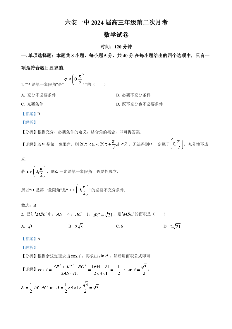 安徽省六安第一中学2023-2024学年高三上学期第二次月考 数学答案