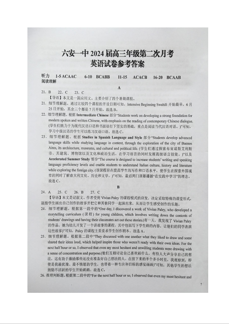 安徽省六安第一中学2023-2024学年高三上学期第二次月考 英语答案
