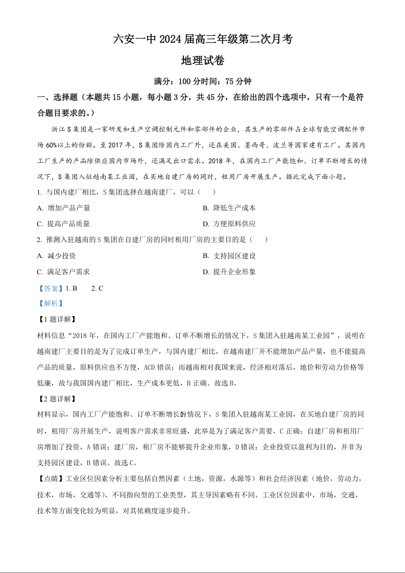 安徽省六安第一中学2023-2024学年高三上学期第二次月考 地理答案
