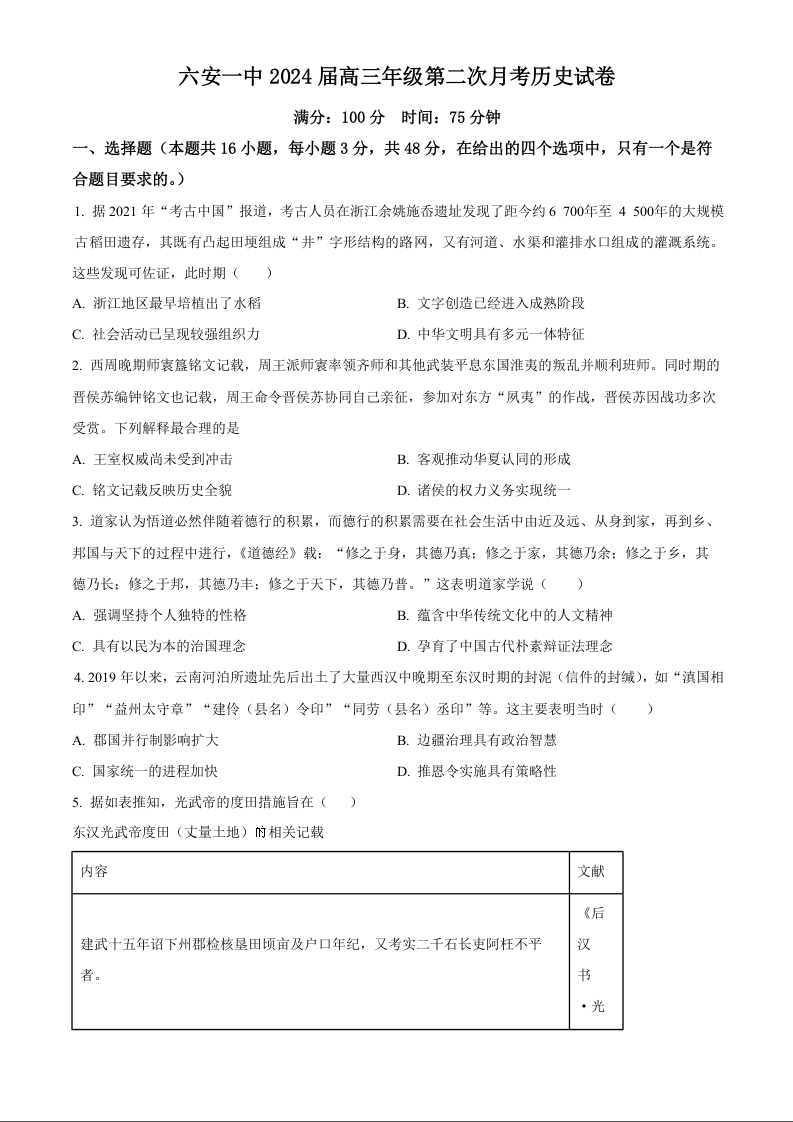 安徽省六安第一中学2023-2024学年高三上学期第二次月考 历史