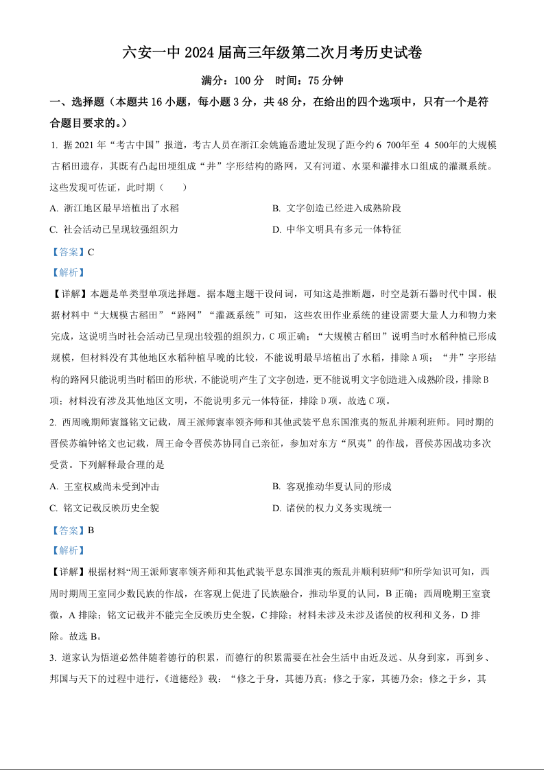 安徽省六安第一中学2023-2024学年高三上学期第二次月考 历史答案