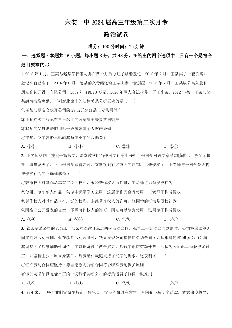安徽省六安第一中学2023-2024学年高三上学期第二次月考 政治