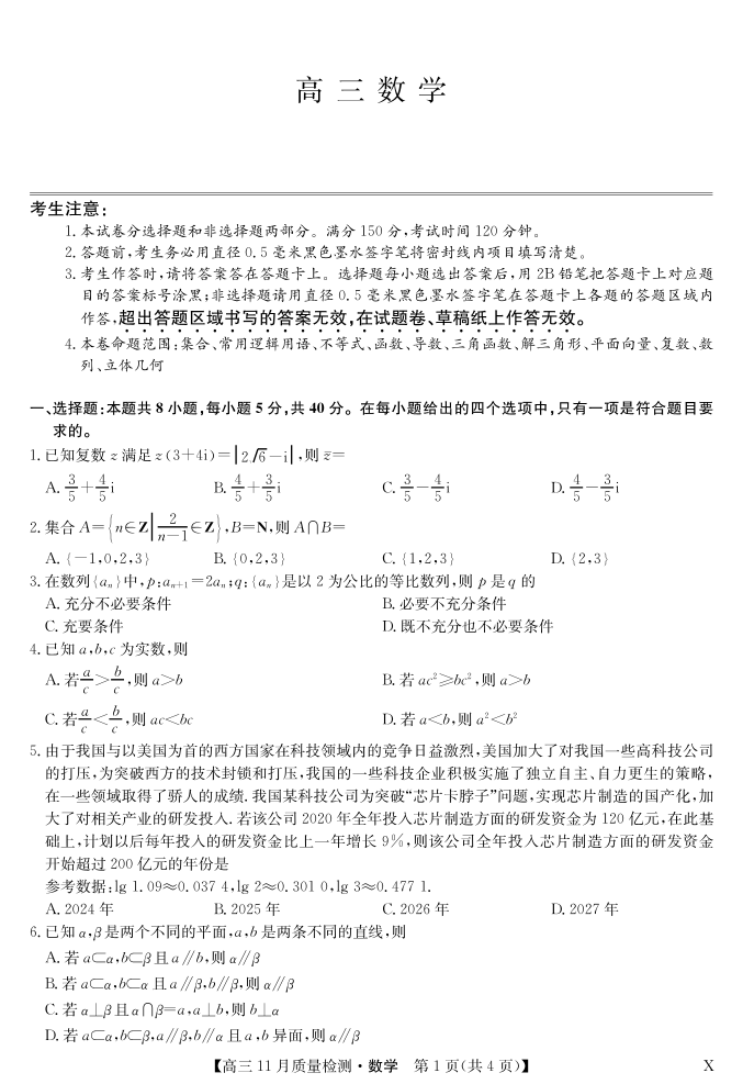 安徽省九师联盟2024届高三11月质量检测 数学