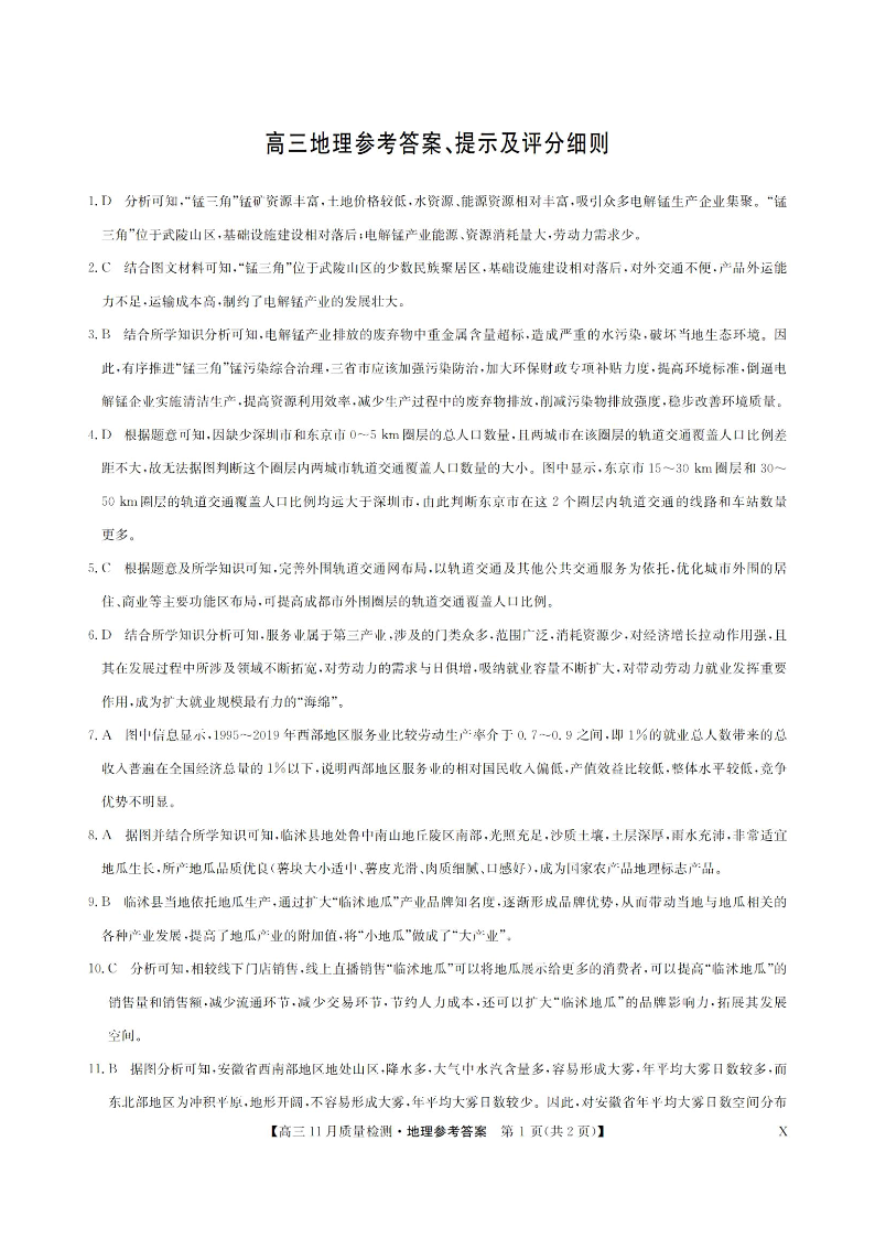 安徽省九师联盟2024届高三11月质量检测 地理答案