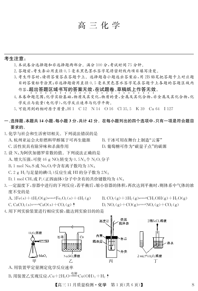 安徽省九师联盟2024届高三11月质量检测 化学