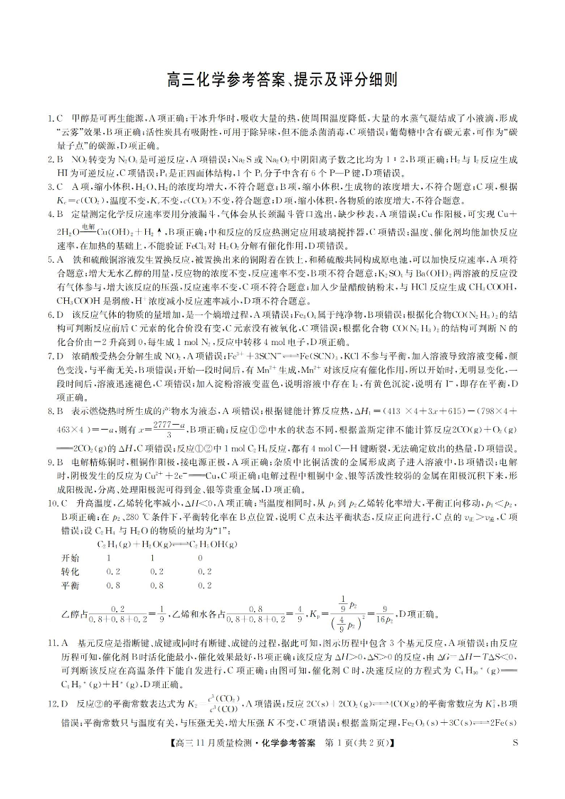 安徽省九师联盟2024届高三11月质量检测 化学答案