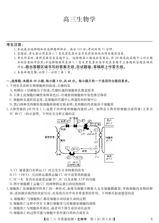 安徽省九师联盟2024届高三11月质量检测 生物