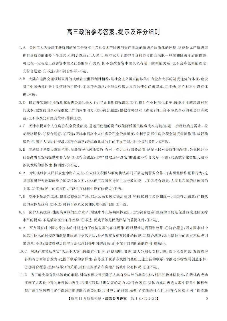安徽省九师联盟2024届高三11月质量检测 政治答案