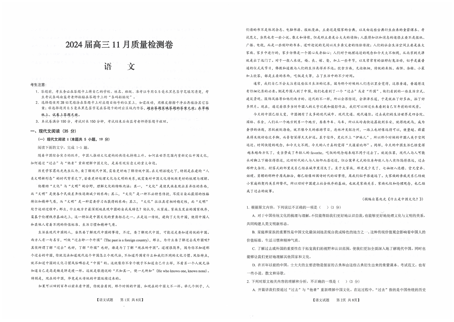 安徽省合肥市第四中学2023-2024学年高三上学期11月月考 语文