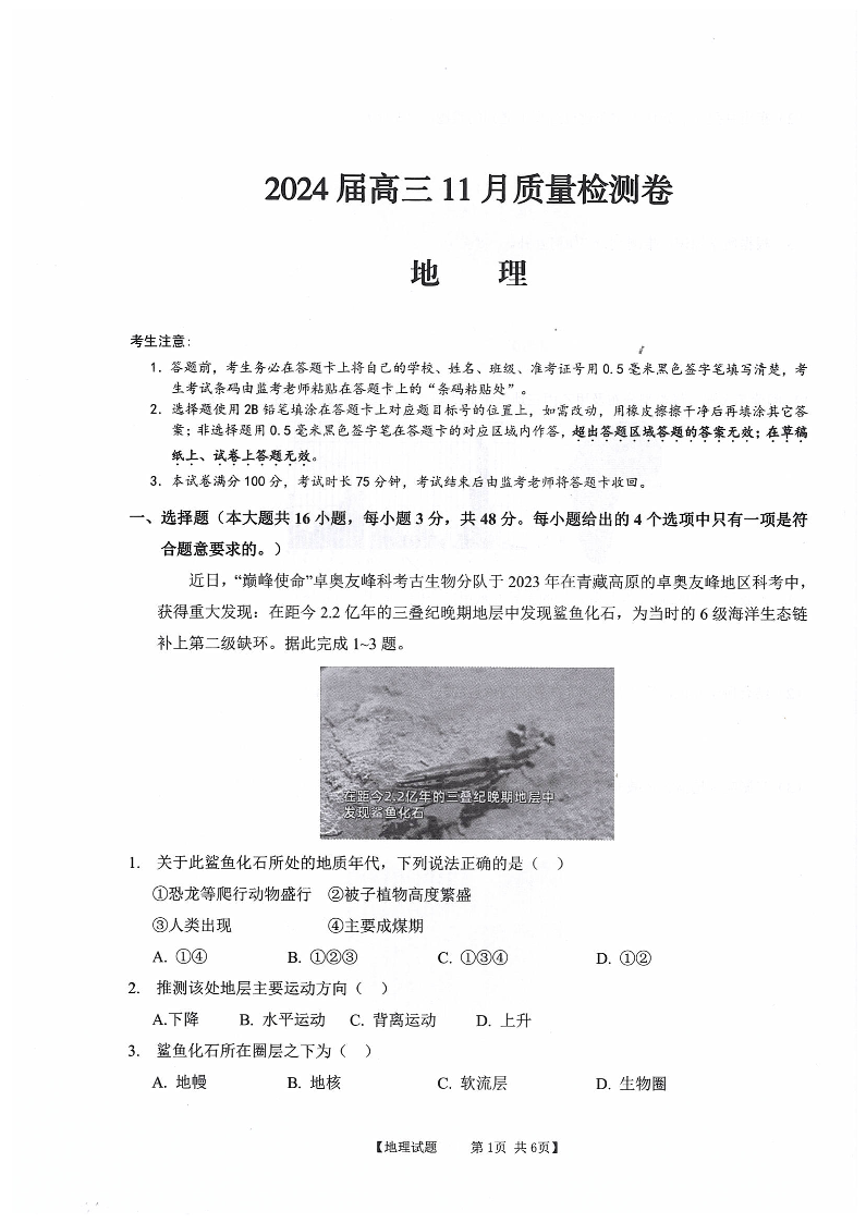 安徽省合肥市第四中学2023-2024学年高三上学期11月月考 地理