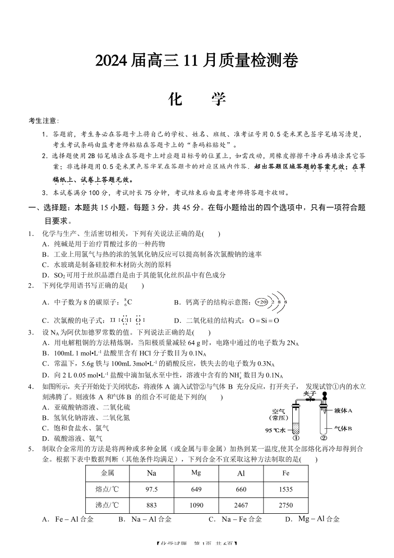 安徽省合肥市第四中学2023-2024学年高三上学期11月月考 化学