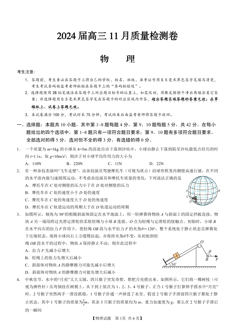 安徽省合肥市第四中学2023-2024学年高三上学期11月月考 物理