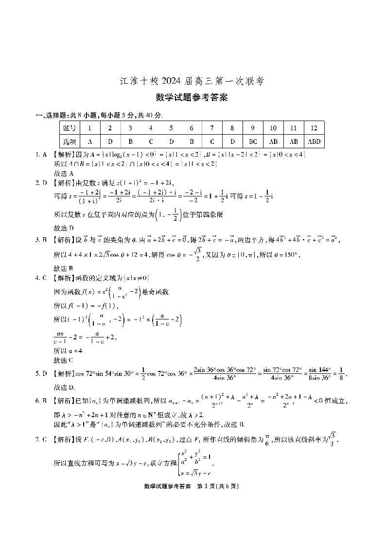 安徽省江淮十校2023-2024学年高三上学期开学考试 数学答案