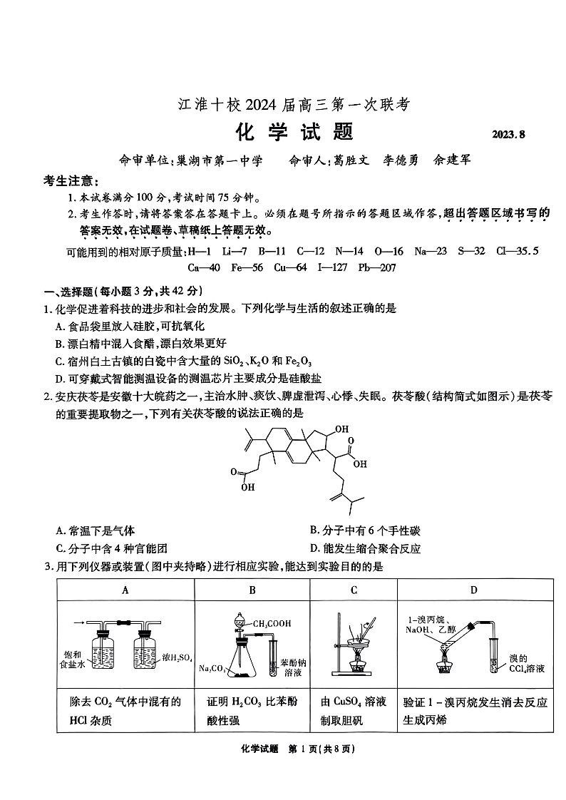 安徽省江淮十校2023-2024学年高三上学期开学考试 化学