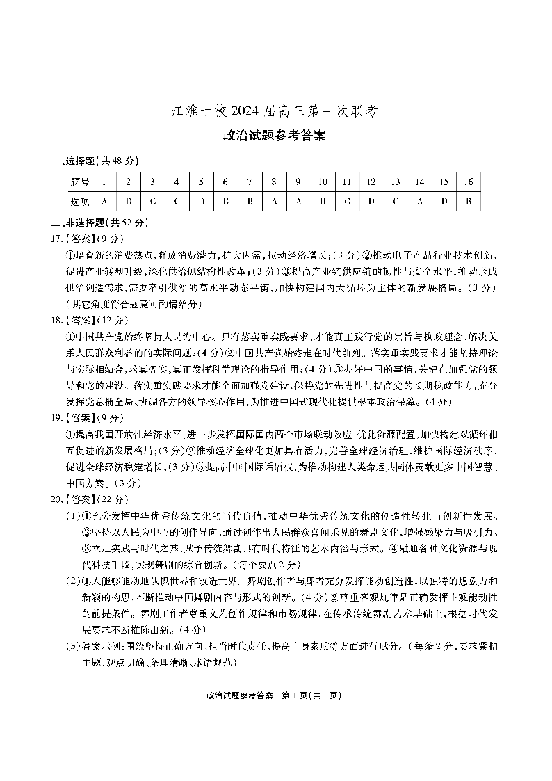 安徽省江淮十校2023-2024学年高三上学期开学考试 政治答案