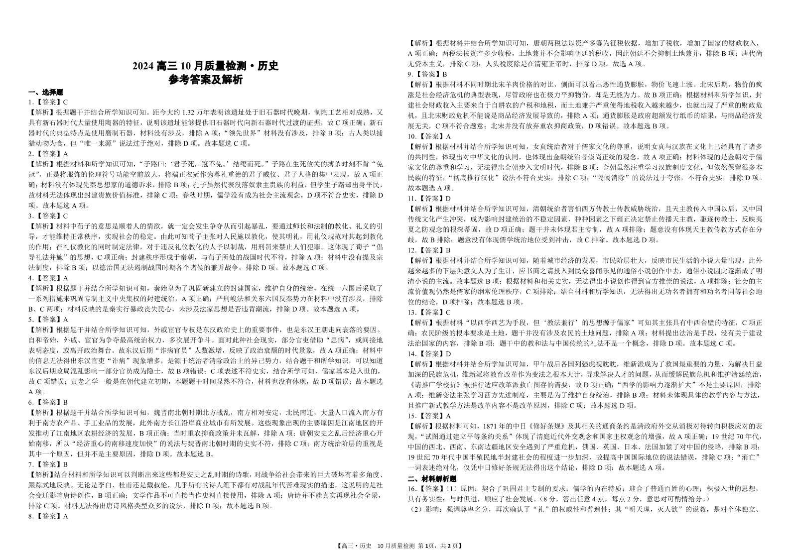 24高三·历史10月检测-参考答案