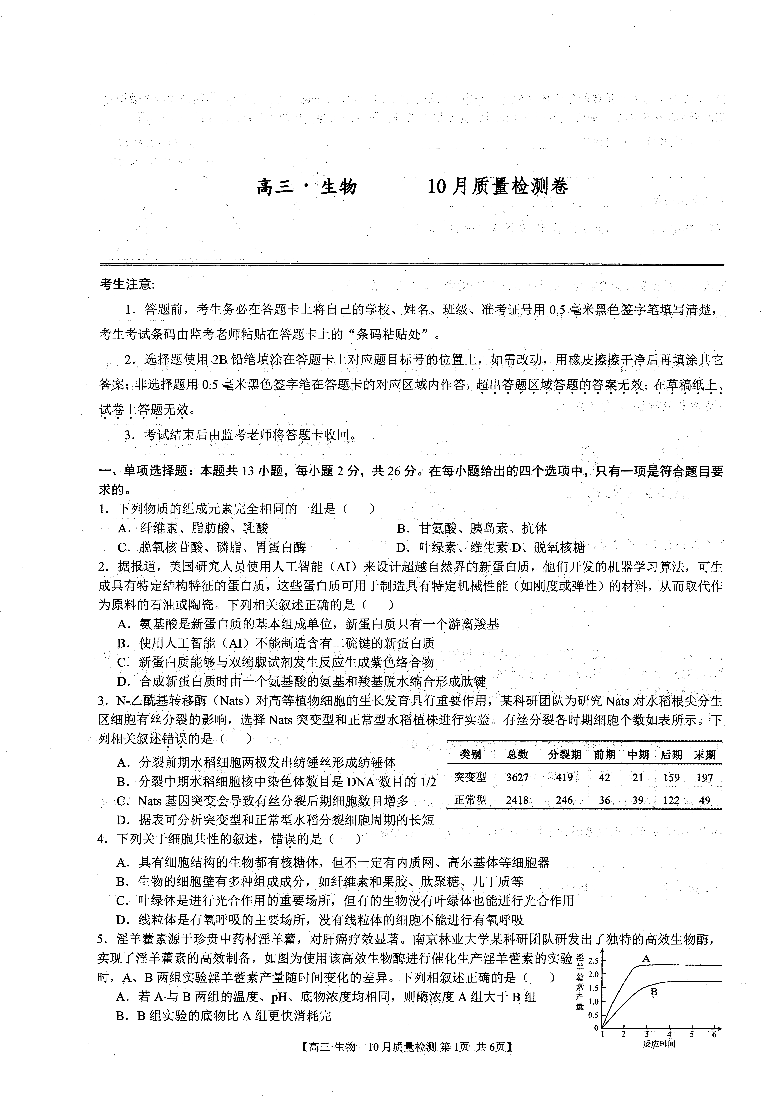 安徽省徽师联盟2023-2024学年高三上学期10月联考 生物