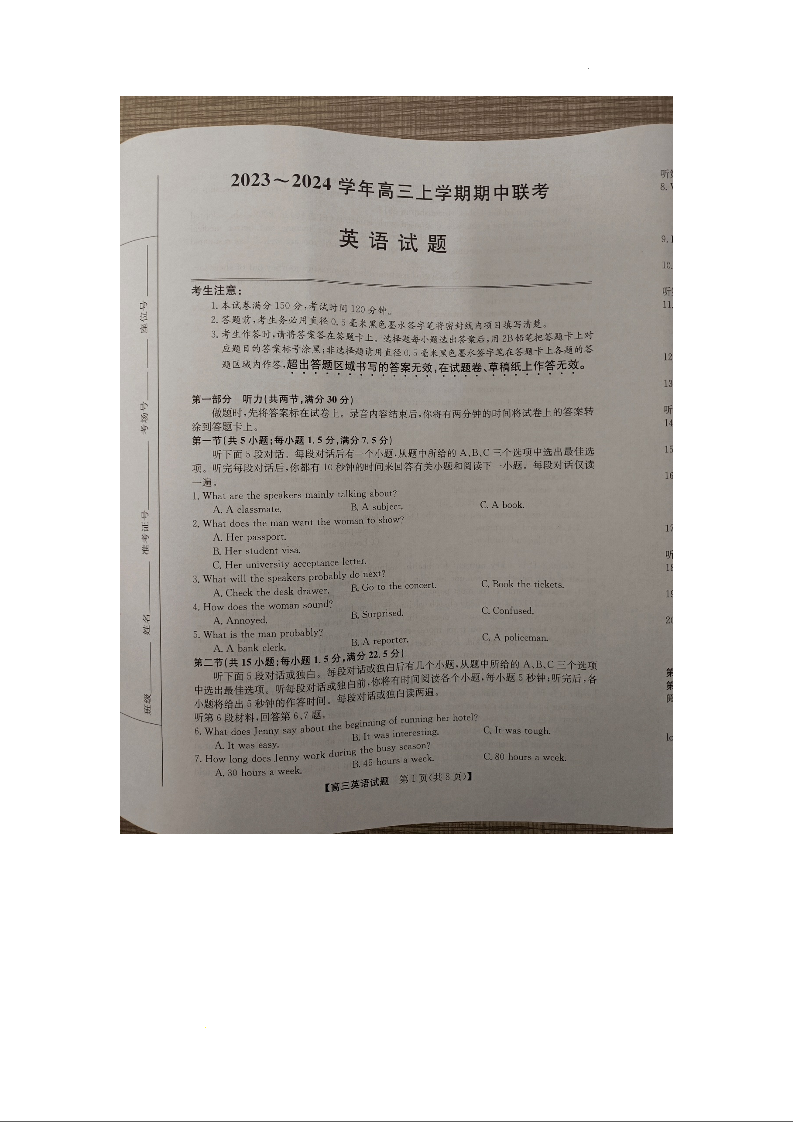 安徽省亳州市蒙城县2023—2024学年高三上学期期中联考 英语