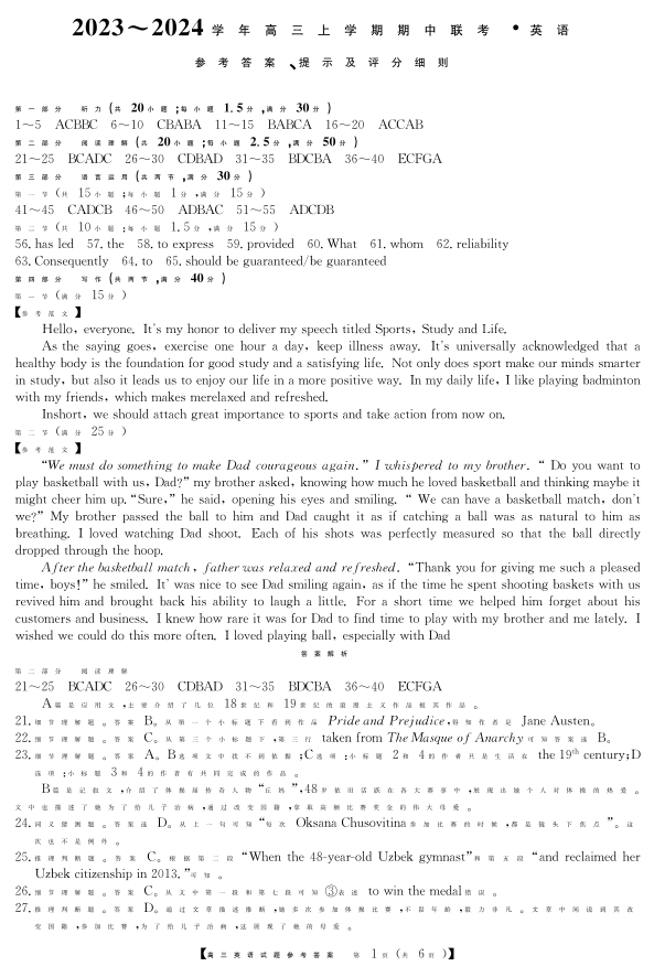 23年11月五校联盟-英语答案