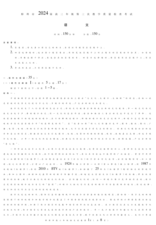安徽省蚌埠市2023-2024学年高三下学期第三次教学质量检查 语文