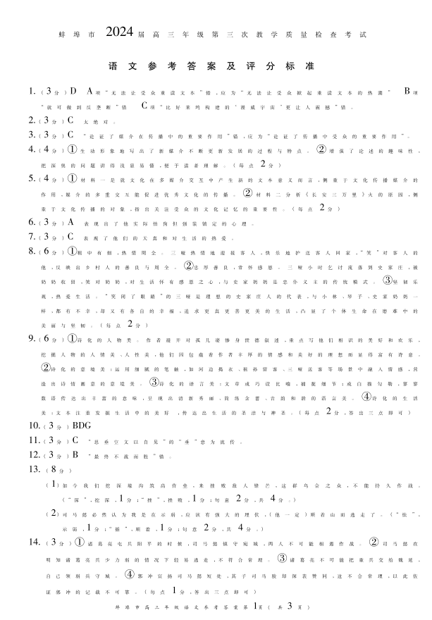 安徽省蚌埠市2023-2024学年高三下学期第三次教学质量检查 语文答案