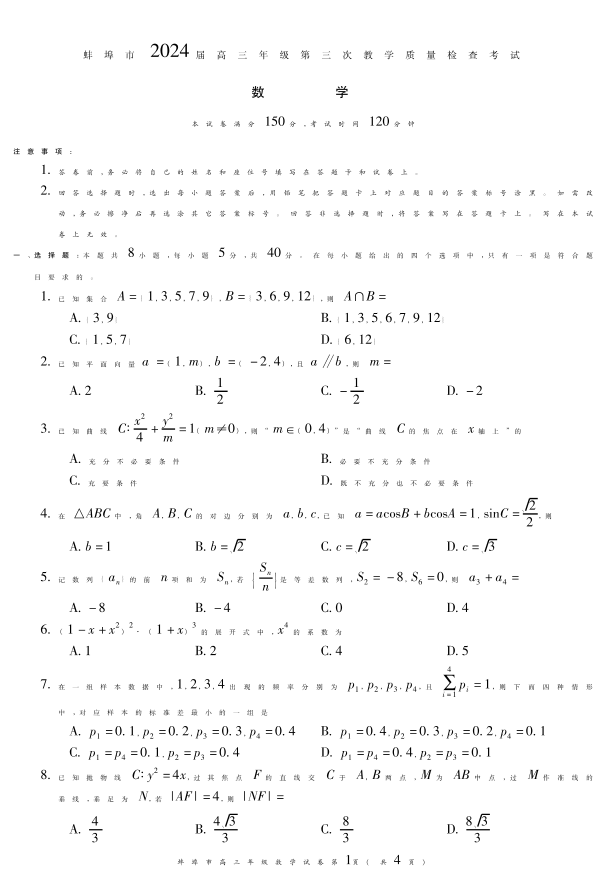 安徽省蚌埠市2023-2024学年高三下学期第三次教学质量检查 数学
