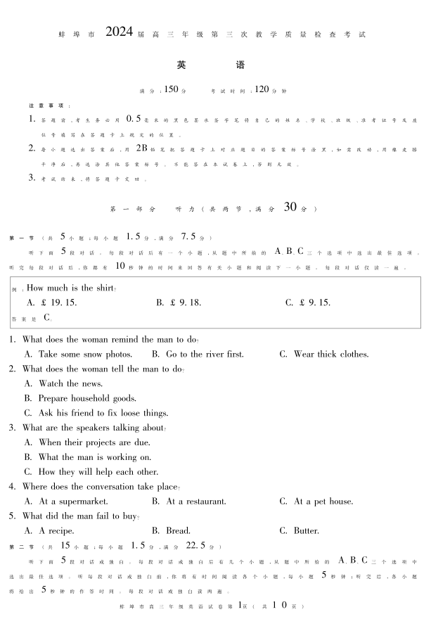 安徽省蚌埠市2023-2024学年高三下学期第三次教学质量检查 英语
