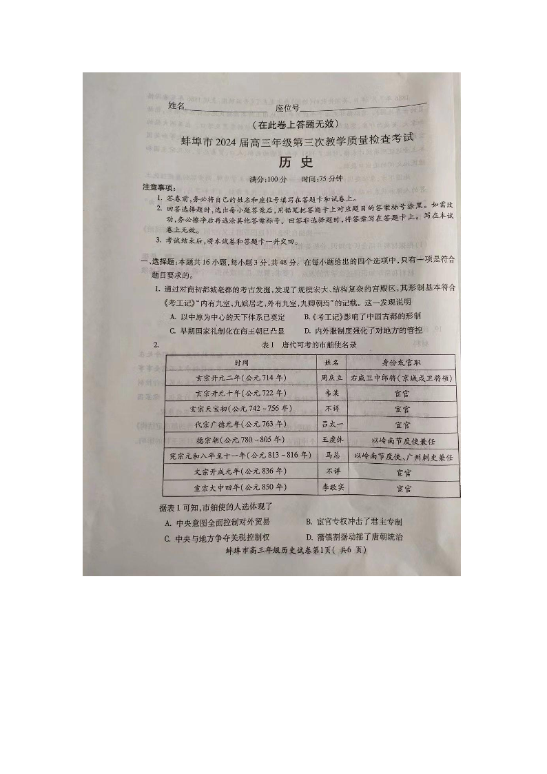 安徽省蚌埠市2023-2024学年高三下学期第三次教学质量检查 历史