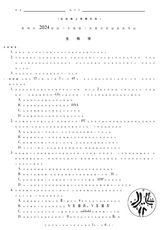 安徽省蚌埠市2023-2024学年高三下学期第三次教学质量检查 生物