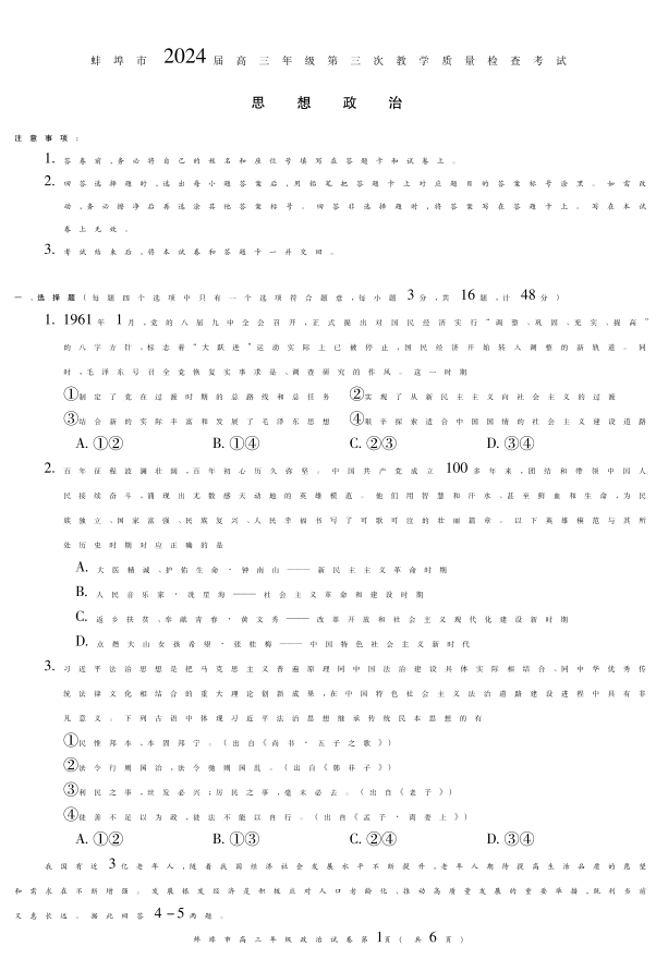 安徽省蚌埠市2023-2024学年高三下学期第三次教学质量检查 政治