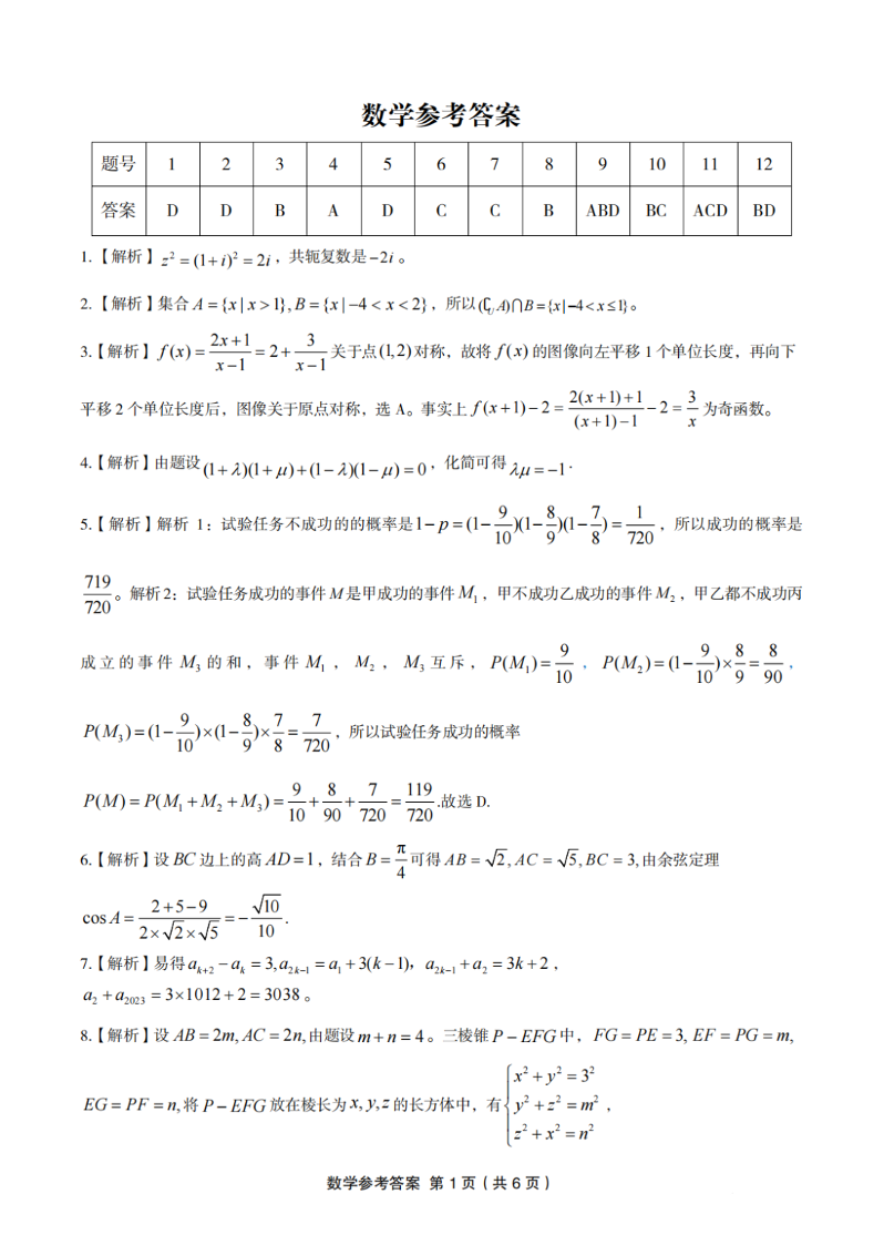 安徽省“皖江名校联盟”2023-2024学年高三上学期12月月考 数学答案