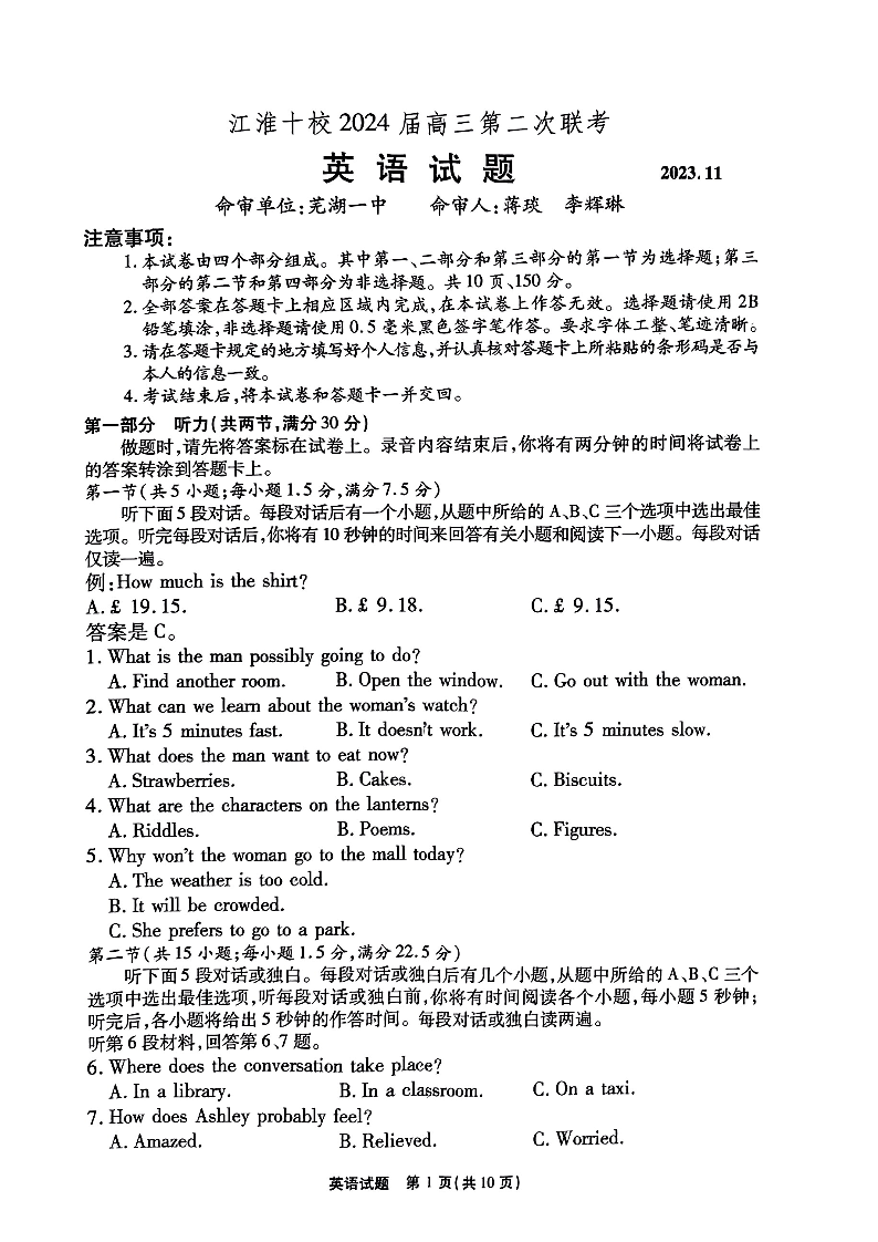 安徽省江淮十校2023-2024学年高三上学期第二次联考 英语