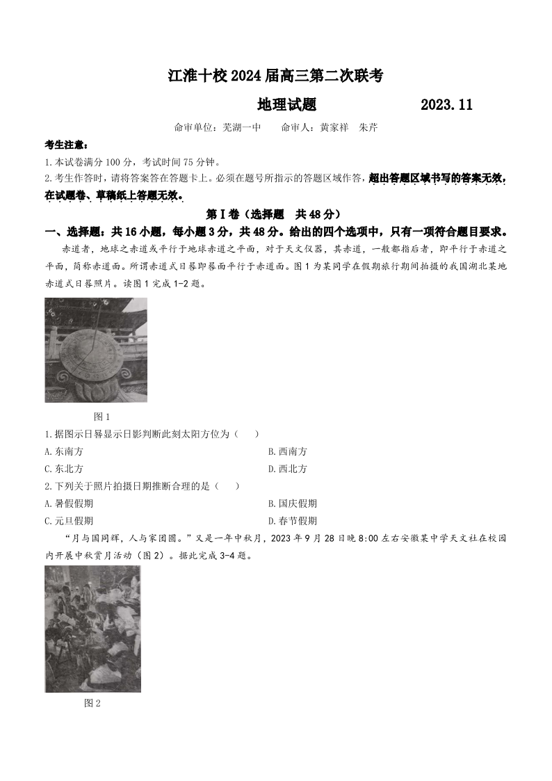 安徽省江淮十校2023-2024学年高三上学期第二次联考 地理