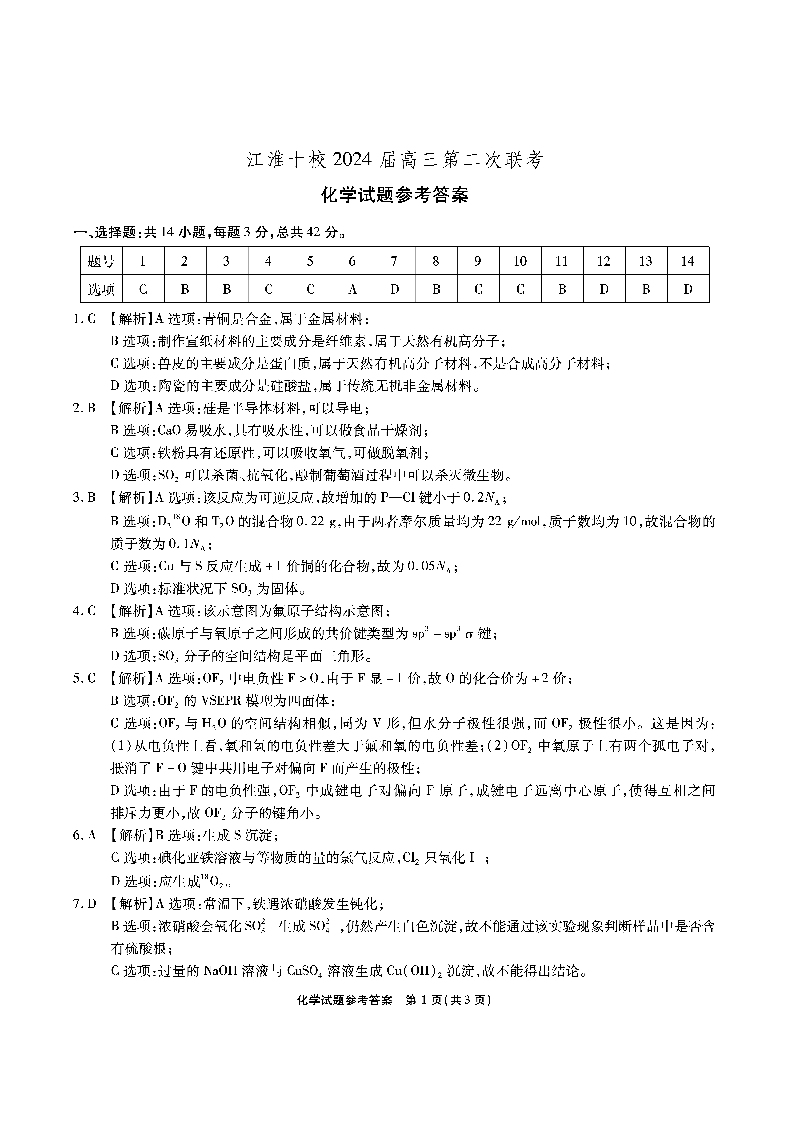 安徽省江淮十校2023-2024学年高三上学期第二次联考 化学答案