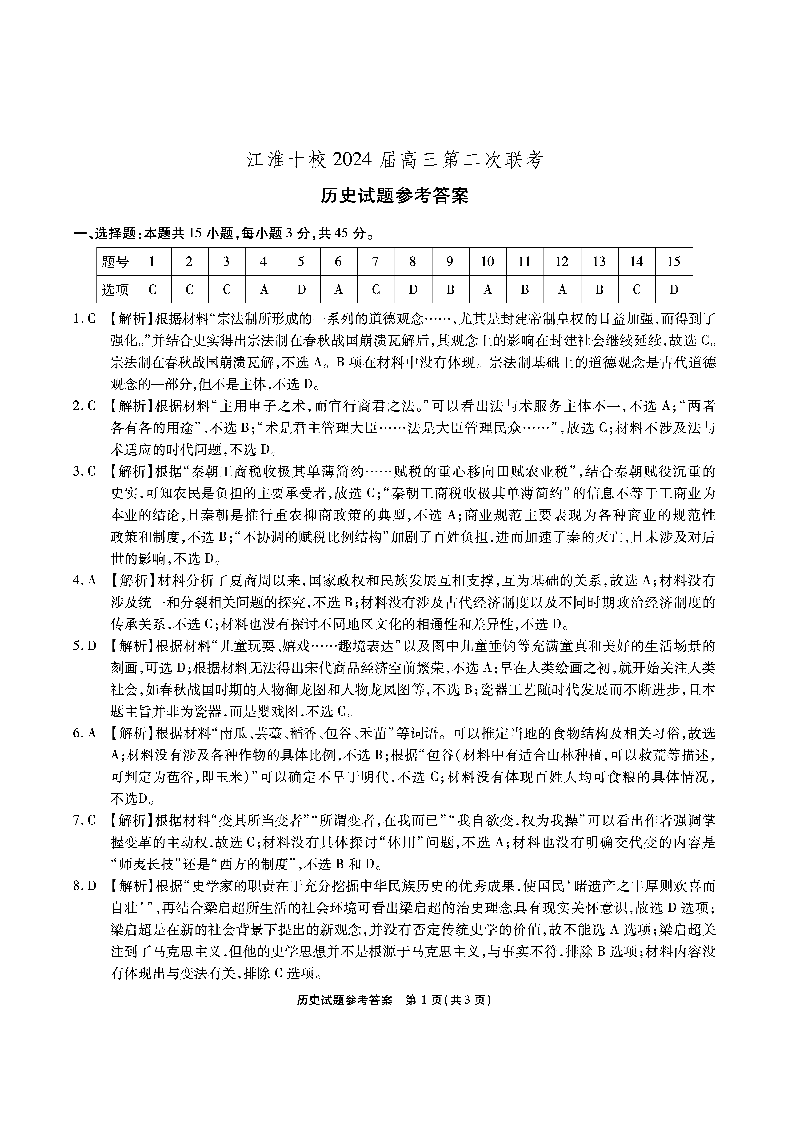 安徽省江淮十校2023-2024学年高三上学期第二次联考 历史答案