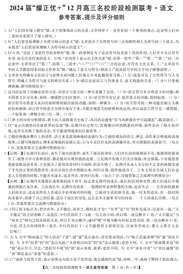 2024届“耀正优+”12月高三名校阶段检测联考 语文答案